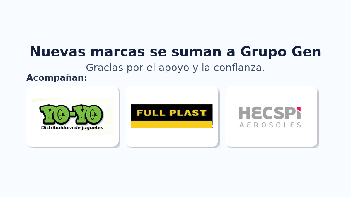 Estamos muy contentos de anunciar que nuevas marcas se unen para apoyar a Grupo Gen. ¡Gracias por confiar en nuestro proyecto y ser parte de este crecimiento! Mención: Acompañan: YO-YO · Full Plast · HECSPI